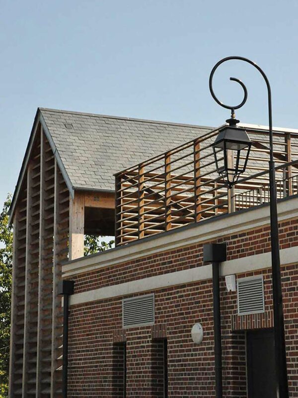 L’architecture du bâti créé se veut respectueuse et discrète, à l’écoute de son environnement immédiat : les volumes s’implantent en retrait de la rue, permettant l’aménagement d’une petite place publique autour d’un frêne remarquable conservé en cœur de site. L’ancien mur en pierre sur rue, témoin du passé, est restauré avec soin et sert de lien patrimonial entre ancien et nouveau.
