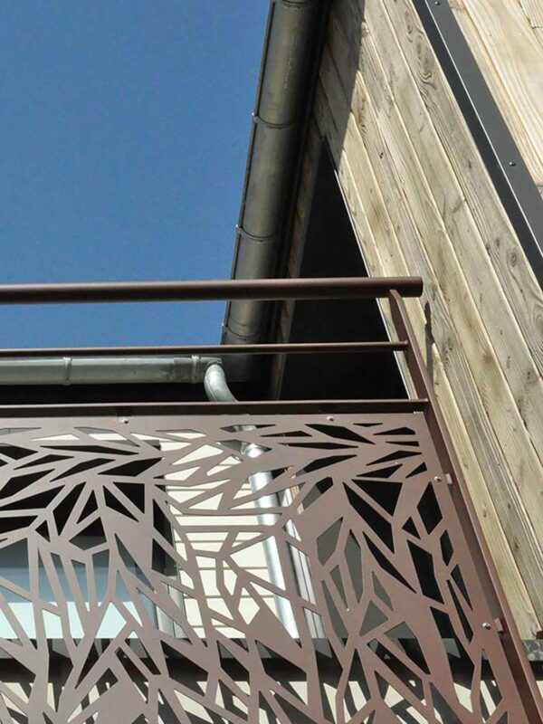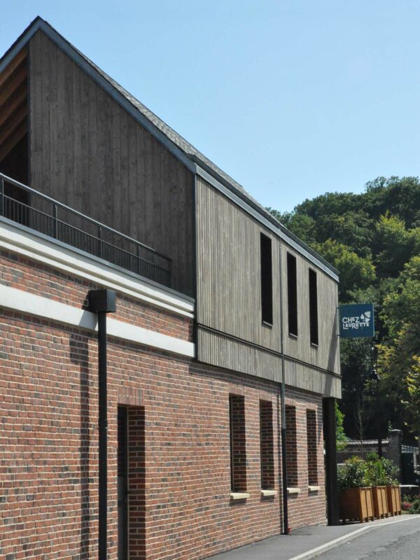 À l’étage, les quatre gîtes ruraux prennent la forme de petites cabanes perchées en bois, insérées parmi les arbres, en clin d’œil à la forêt toute proche. Reposant sur une base en brique, elles évoquent la pharmacie voisine, assurant une continuité matérielle et esthétique.