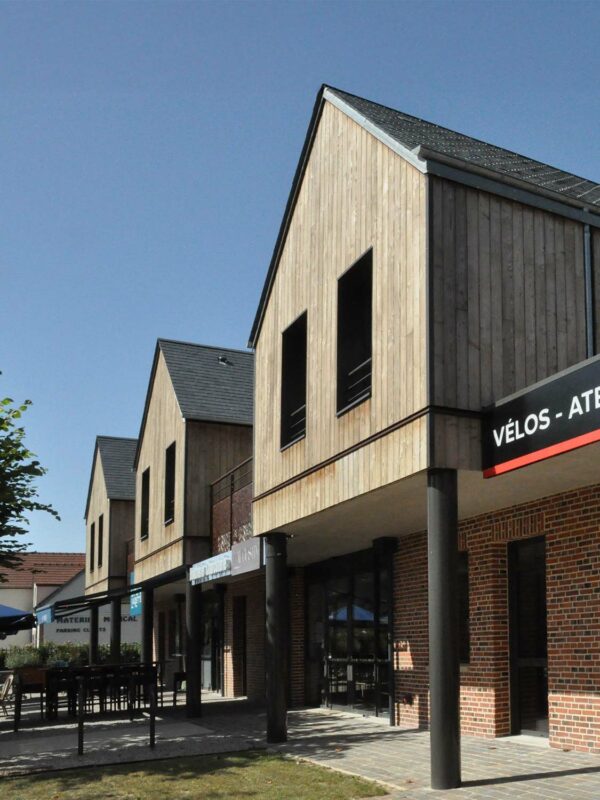 En rez-de-chaussée, des arcades protègent les vitrines des commerces, à la fois contre le soleil et les intempéries, tout en animant l’espace public. Elles prolongent un cheminement piéton jusqu’à la pharmacie, facilitant les circulations douces et créant une continuité villageoise.