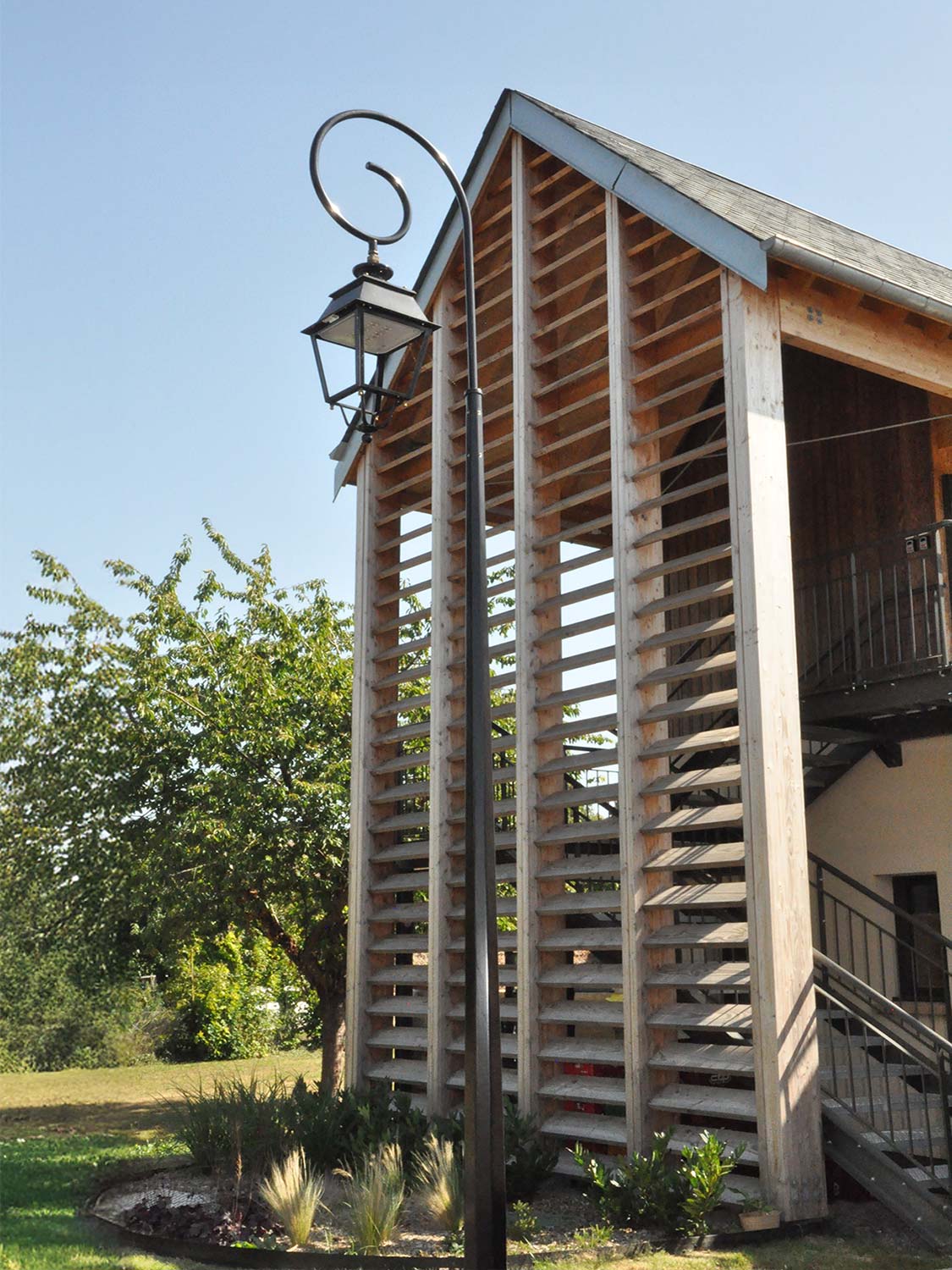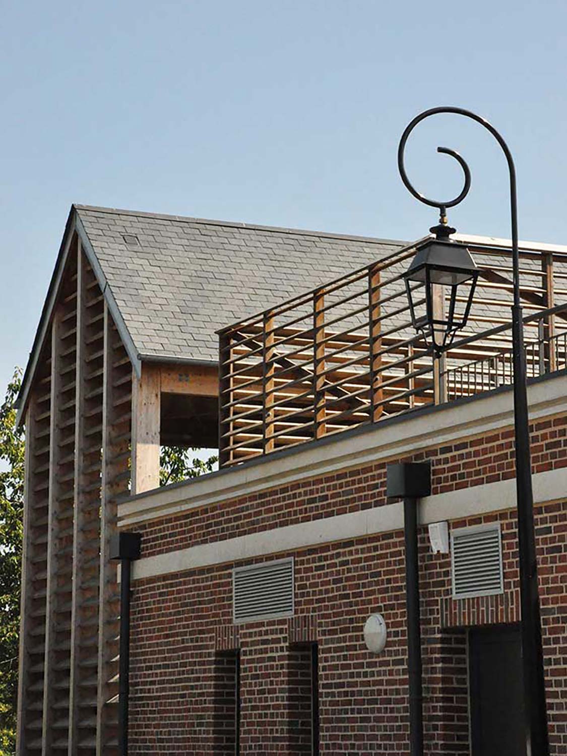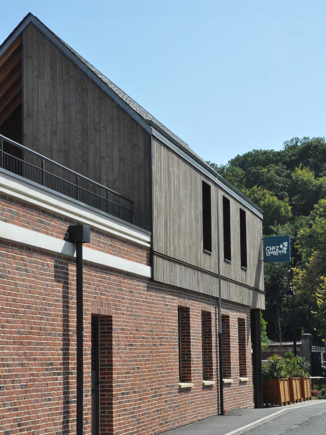 À l’étage, les quatre gîtes ruraux prennent la forme de petites cabanes perchées en bois, insérées parmi les arbres, en clin d’œil à la forêt toute proche. Reposant sur une base en brique, elles évoquent la pharmacie voisine, assurant une continuité matérielle et esthétique.