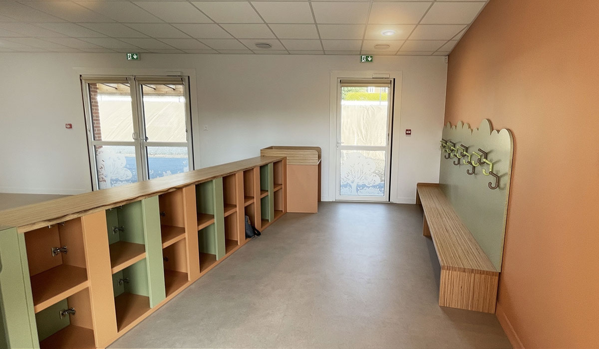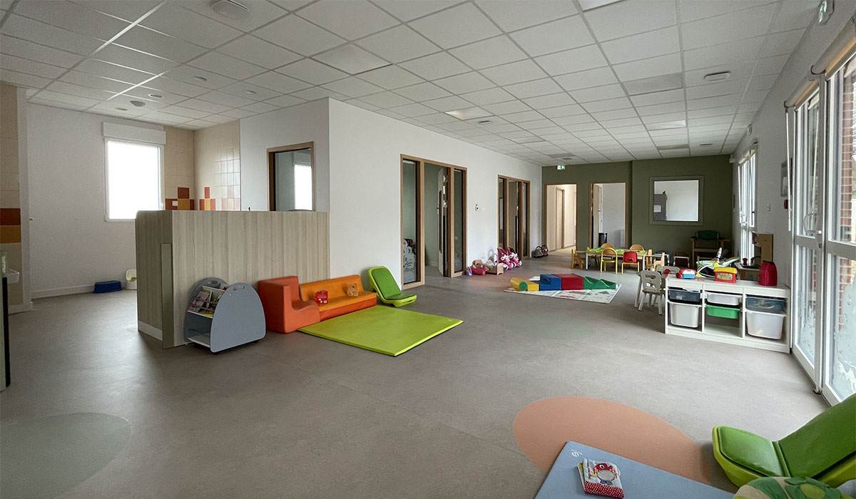 L’implantation du bâtiment se concentre sur la partie basse, accessible par deux entrées depuis la rue Basse, facilitant ainsi l’accueil des usagers. Le programme architectural développe une surface de 224 m², organisée autour d’espaces fonctionnels adaptés aux besoins des assistantes maternelles et des enfants. Le bâtiment comprend un hall d’entrée, un bureau, deux dortoirs, des locaux techniques (buanderie, local linge, local ménage), un local change, un office, un rangement, ainsi qu’une grande salle d’activités et de repas de 72,5 m² favorisant un cadre convivial et sécurisé.
