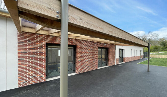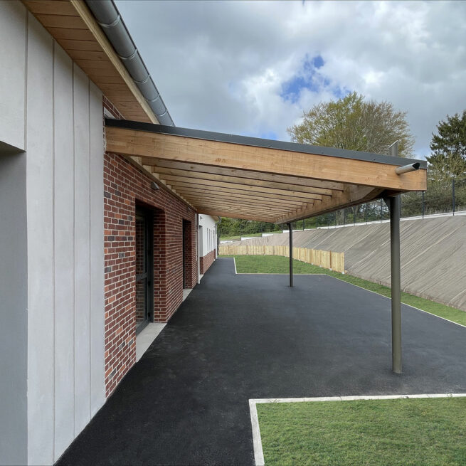 L’aménagement extérieur prévoit également deux locaux annexes dédiés au rangement et au stationnement des poussettes, optimisant la fonctionnalité du site. L’ensemble du projet vise à créer un équipement moderne et harmonieux, respectueux du contexte paysager et urbain, tout en offrant un service de qualité pour la garde d’enfants au sein de la commune.