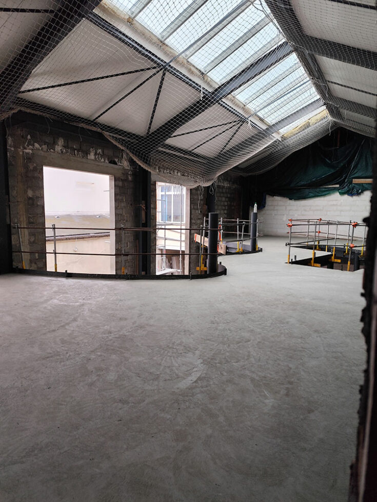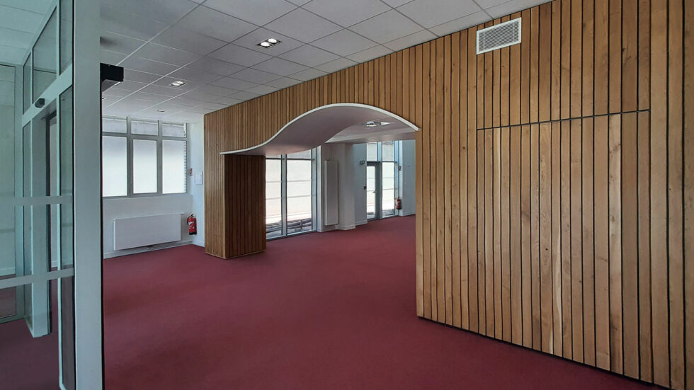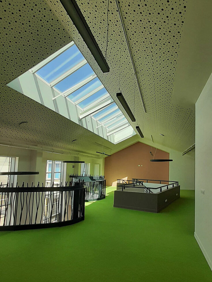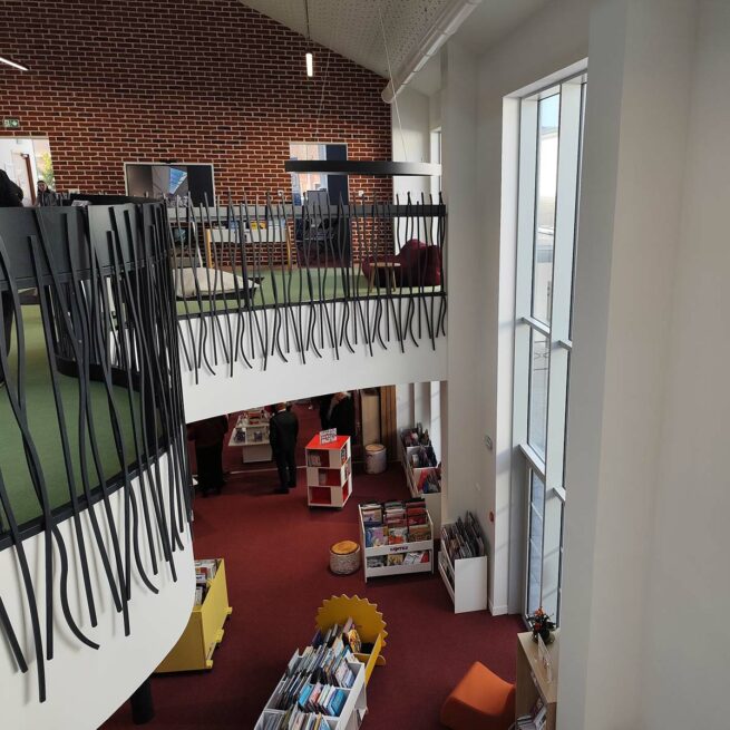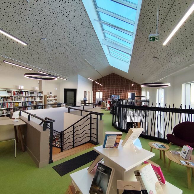 Une mezzanine en structure métallique vient habiter le volume principal, offrant un second niveau accessible par un escalier léger et ouvert. En toiture, une verrière complète le dispositif d’éclairement et confère à l’ensemble une atmosphère chaleureuse et propice à la lecture et à la découverte. Les deux salles de réunion attenantes, aujourd’hui propriété de la mairie, sont intégrées au projet. Elles accueillent à rez-de-chaussée l’espace d’entrée, d’attente et de détente, tandis qu’à l’étage sont aménagés un local audiovisuel pour le public et une salle de repos pour le personnel.