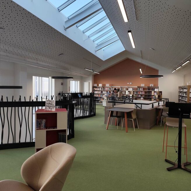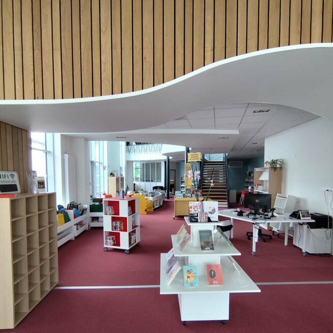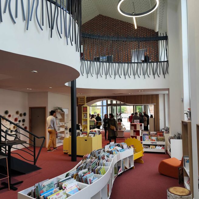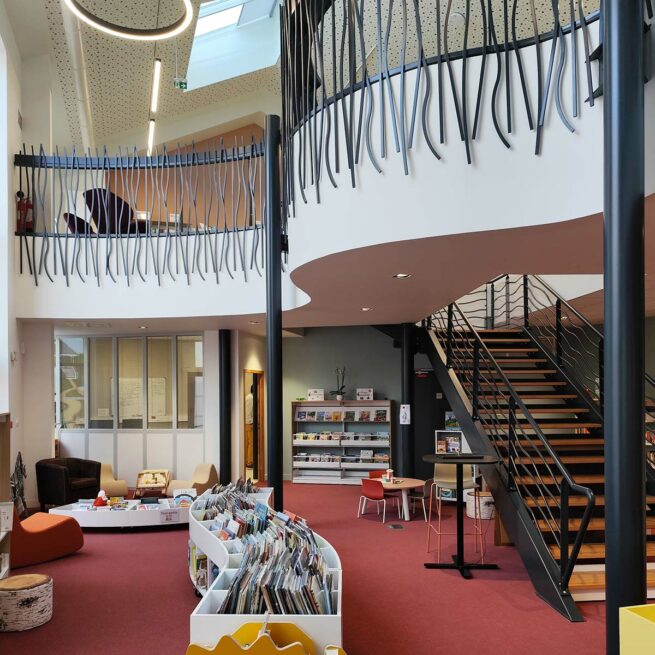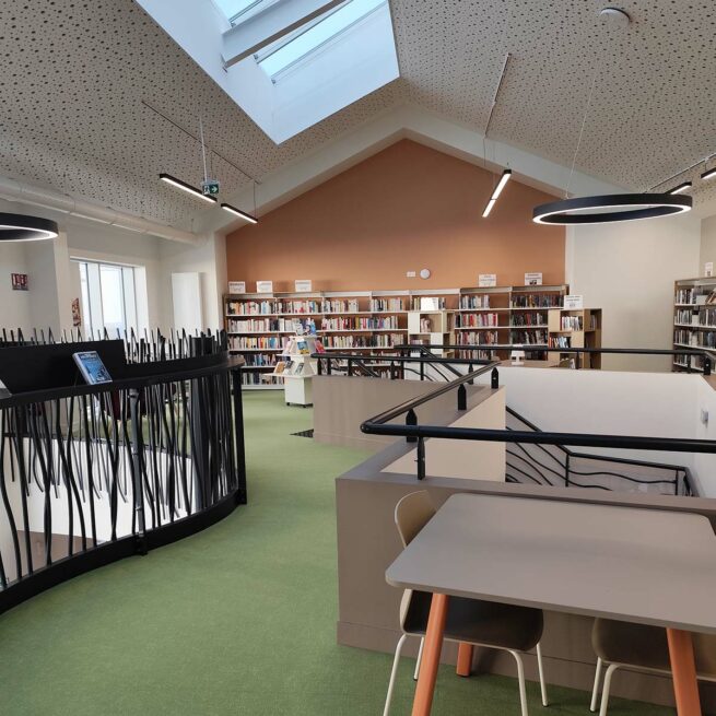 La mise en accessibilité, la mutualisation des circulations verticales et la mise aux normes de sécurité font partie intégrante de cette réhabilitation. En réinterprétant un bâtiment existant avec intelligence et sobriété, le projet inscrit la médiathèque comme un pôle culturel fédérateur, ancré dans l’histoire et tourné vers les usages de demain.