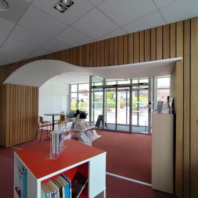 Le projet valorise les qualités spatiales du cinéma d’origine tout en les adaptant aux exigences d’un établissement public contemporain. Une nouvelle entrée est aménagée sur le square Fernand Lemaire, créant un lien direct et symbolique avec les autres équipements municipaux et renforçant la visibilité de la médiathèque au cœur du tissu urbain. Le bâtiment s’ouvre également sur la sente latérale grâce à de hautes baies vitrées insérées dans le mur existant, permettant à la lumière naturelle de pénétrer largement dans les espaces intérieurs.