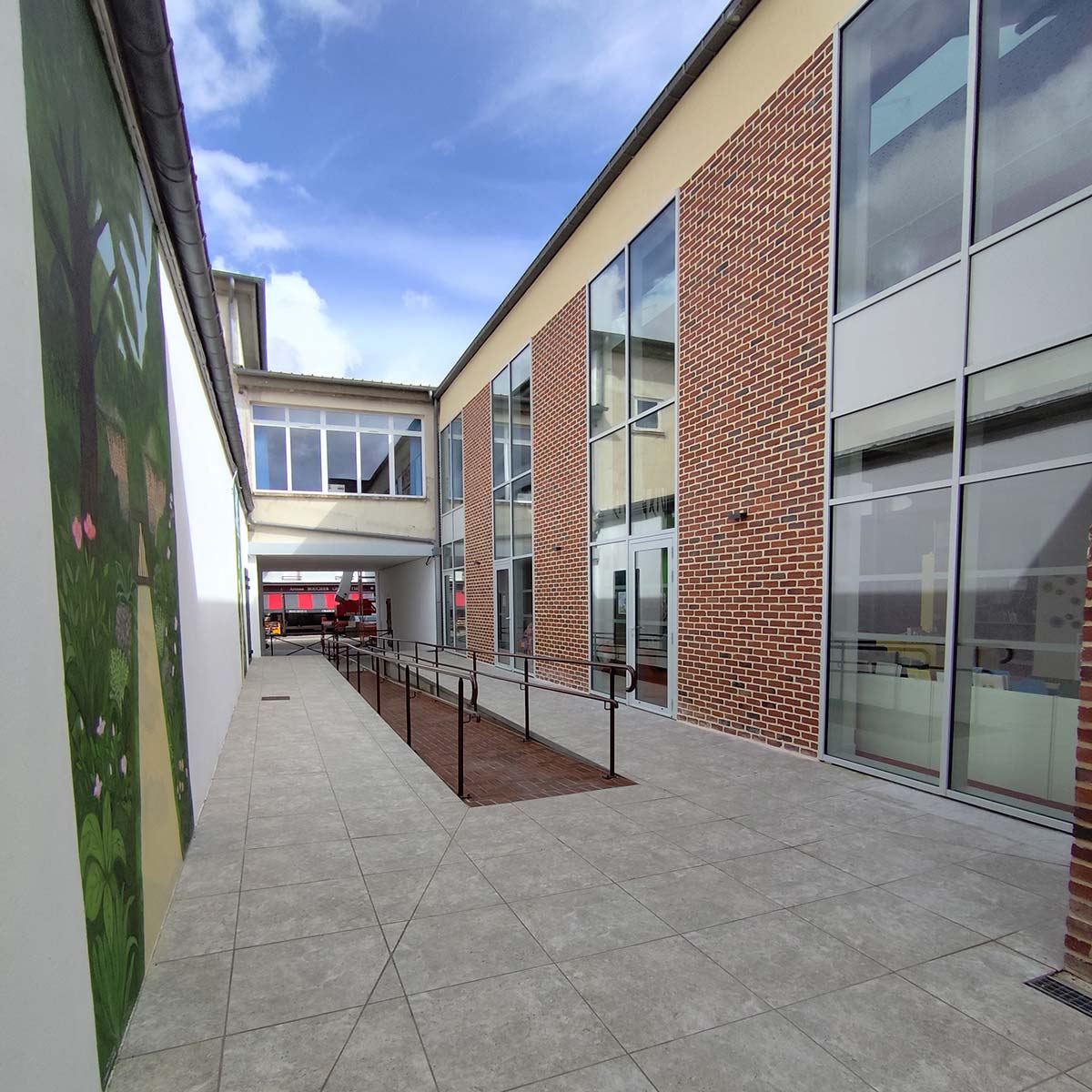 La commune de Grandvilliers engage une transformation ambitieuse de son ancien cinéma municipal pour y accueillir les nouveaux locaux de la médiathèque. Situé à l’arrière de la mairie, ce bâtiment emblématique de l’après-guerre, composé d’un haut volume en brique et moellons, se voit ainsi reconverti en un équipement culturel ouvert, lumineux et structurant pour la ville.