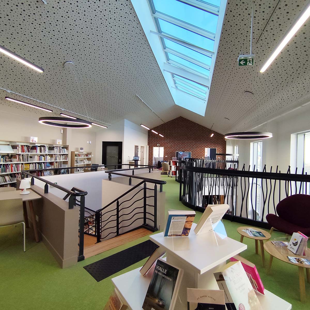 La mise en accessibilité, la mutualisation des circulations verticales et la mise aux normes de sécurité font partie intégrante de cette réhabilitation. En réinterprétant un bâtiment existant avec intelligence et sobriété, le projet inscrit la médiathèque comme un pôle culturel fédérateur, ancré dans l’histoire et tourné vers les usages de demain.